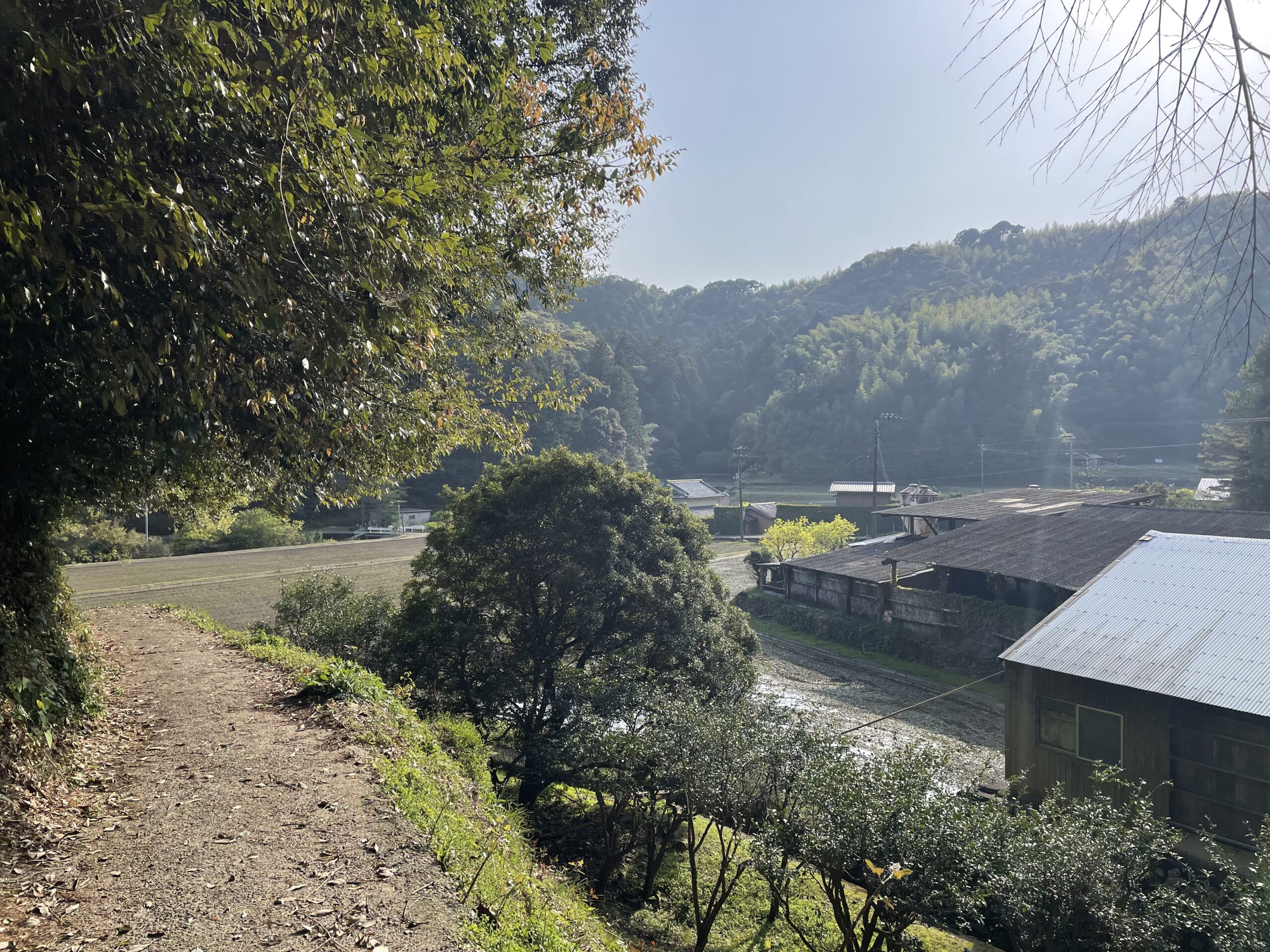 車道から脇道に上ったあとは、しばらくミカン畑に挟まれた小道をいく。しかし、最初に通ってきたあたりとは違って畑は荒れ放題だった。1,2軒ほど廃屋が残されてるのみで民家もなく、道が舗装されている分かえって侘しさが際立つ。昔はミカンを満載した軽トラックがここを行き来していたのかな、などと想像しながら歩いていく。