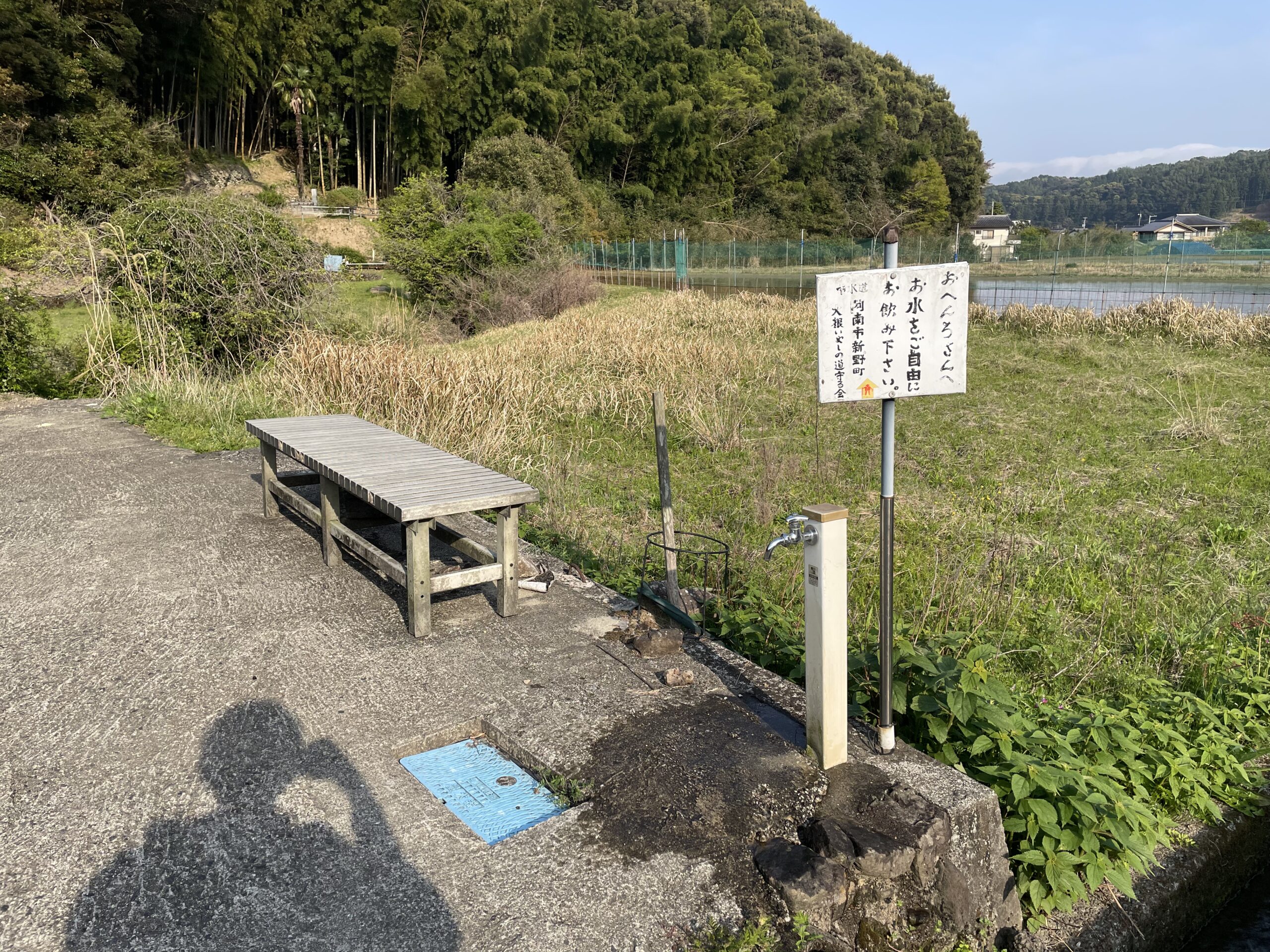 田んぼの間の農道をさらに進むと「お水をご自由にお飲みください」と水道とベンチが設置されていた。それを見て急激に喉の渇きを覚え、金剛杖をベンチに放り出して貪るように水を飲んだ。汗まみれになった手も、腕のところまで冷たい水で洗うと気分がスッキリする。この感覚は久しぶりだ。意外に思われるかもれないが、スペインの水道水はそのまま飲める。巡礼路の沿道や公園には水道がたくさんあって、飲むだけでなく火照った体を冷やしたりタオルを濡らしたりとお世話になった。日本の方が色々と規制の壁が難しいのか、公共の蛇口に巡りあうことが少なかった(その代わり自販機がある。顔は洗えないが)。