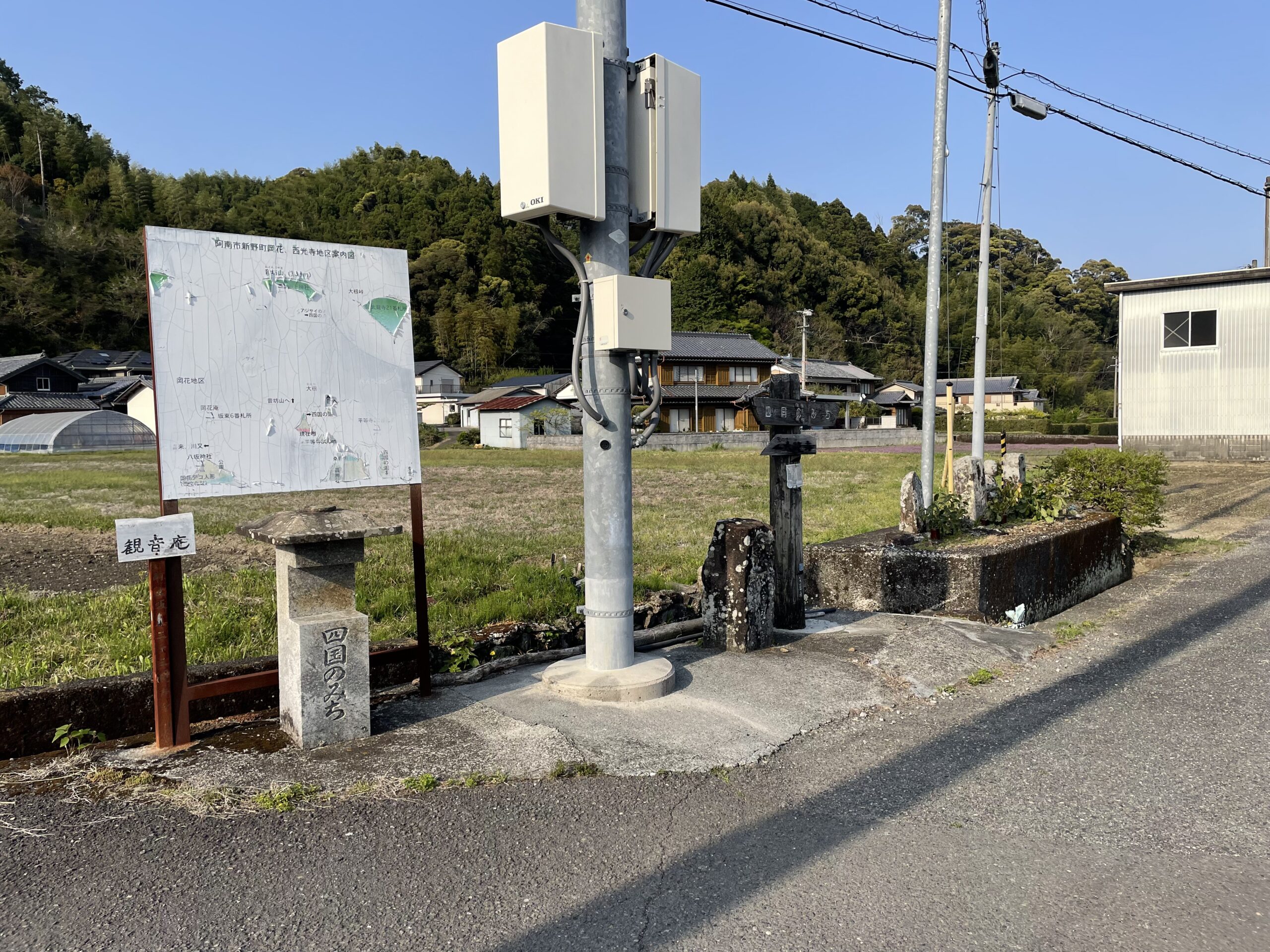 付近には「四国のみち」の地図つき案内板もあった。遍路道と「四国のみち」は重複している部分も多いのでこのシリーズの地図はよく見かけるのだが、そのたびに思う。かわいい絵柄に「みかん畑のみち」とか「竹林とすだち香るみち」とかポップなタイトルがついており、おでかけウォーキングコースみたいな感じで軽く案内してくれるけど、距離だけで標高を書いていないのは罠だろう…。たまには週末に運動でもするかー、みたいな人が前情報なしにこの看板だけ見て歩いたらだいぶ危険な気がするのだが。