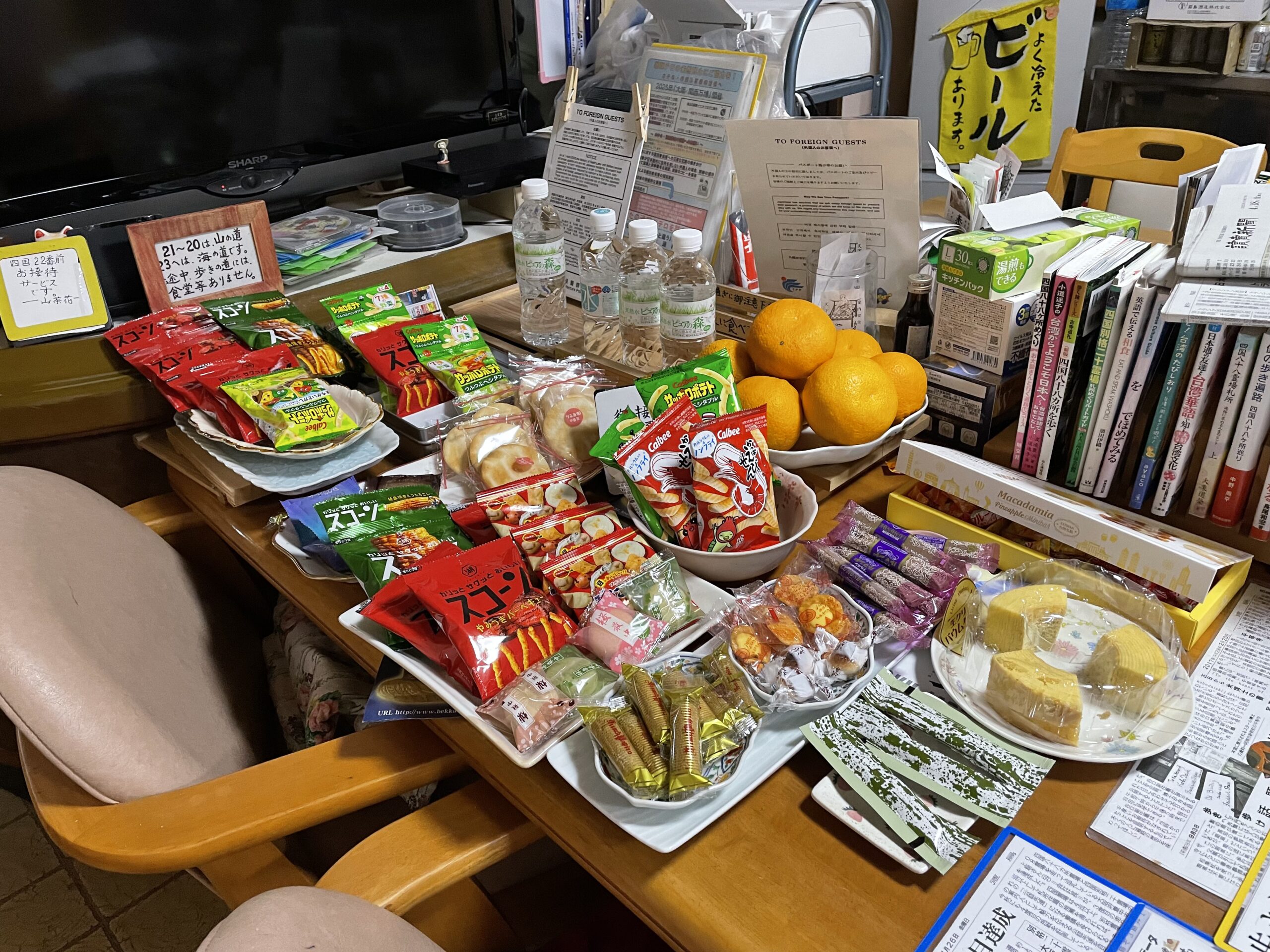 山茶花さんは、なんと洗濯乾燥が無料(お接待)である。とても助かる。お風呂から上がって洗濯機に向かうと、ご主人が食堂兼ロビーにあるお接待コーナーにお菓子や果物をモリモリ盛ってくれていた。水のペットボトルもある。へろへろで辿り着いた遍路たちのために心尽くしの数々で、本当にありがたい。