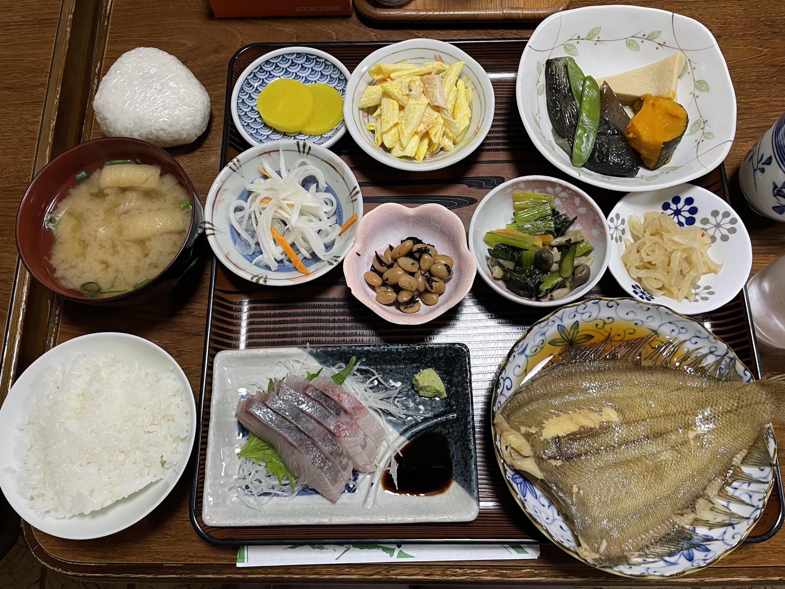18:00から食堂で夕食をいただいた。カウンターの向こうに見えるキッチンは業務用のそれで、尋ねてみるとやはり昔は食堂をされていたとのことだ。今日もご飯をおかわり、といいたいところだが、食べそびれていたおにぎりがあったのでそれを2杯目の代わりにする。