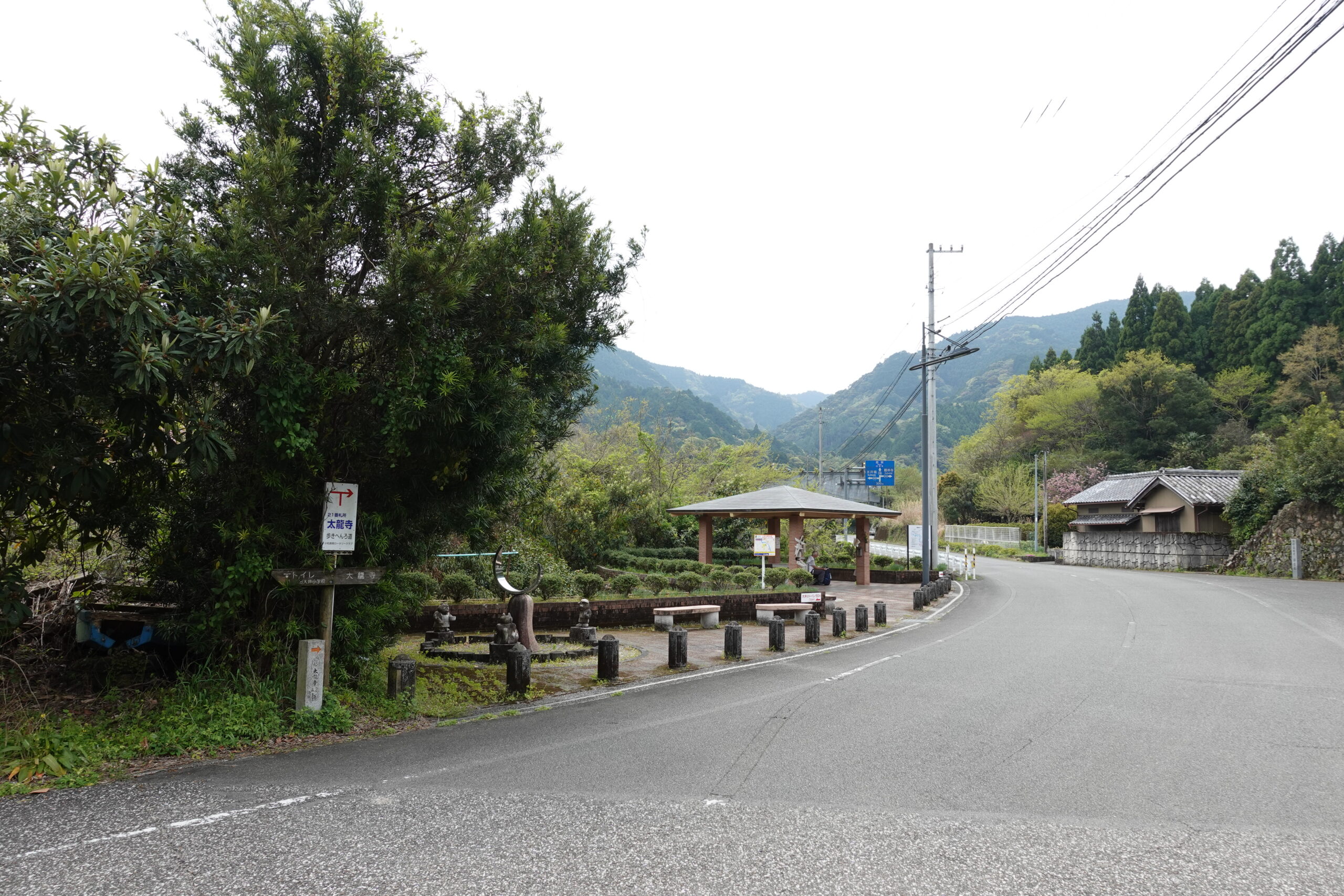 遍路道あるある、民家の軒先をかすめて車道に下りた。久しぶりの広めの道路は県道19号線だ。立派な休憩所(大井休憩所)があり、カナダおじちゃんがパンを食べながら休んでいた。手前の広場には謎のオブジェがあり、虚無なパンダママの表情に思わず引き込まれる。休憩所の横に太龍寺への遍路道マップがあり、それによるとここから太龍寺へは3通りの行き方があるようだ。いわゆる「へんろ転がし」を行く「太龍寺道」(4.2km)、1365年の丁石があり「最古の遍路道」とよばれる「かも道」(8.6km)、そして県道を進みロープウェイを利用する道(7km+ロープウェイ)。