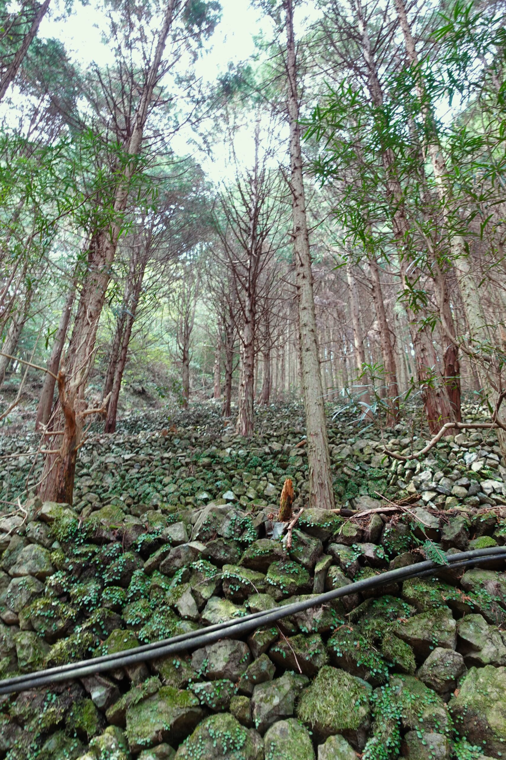気を抜いたら一番下まで転がり落ちそうな階段を下ってしばらくは、とても立派な石垣が連なる一角があった。4段、5段と目で見える限りのずっと上のほうまで続いていて壮観だ。平らな部分が多く作ってあるので、みかん畑というよりは田んぼだったのかな?いつ頃放棄されたのだろう、もうすっかり杉林になってしまっている。二度目の急階段を前に少し休んでいたら、カナダから来たというおじちゃんが颯爽と追い抜いていった。