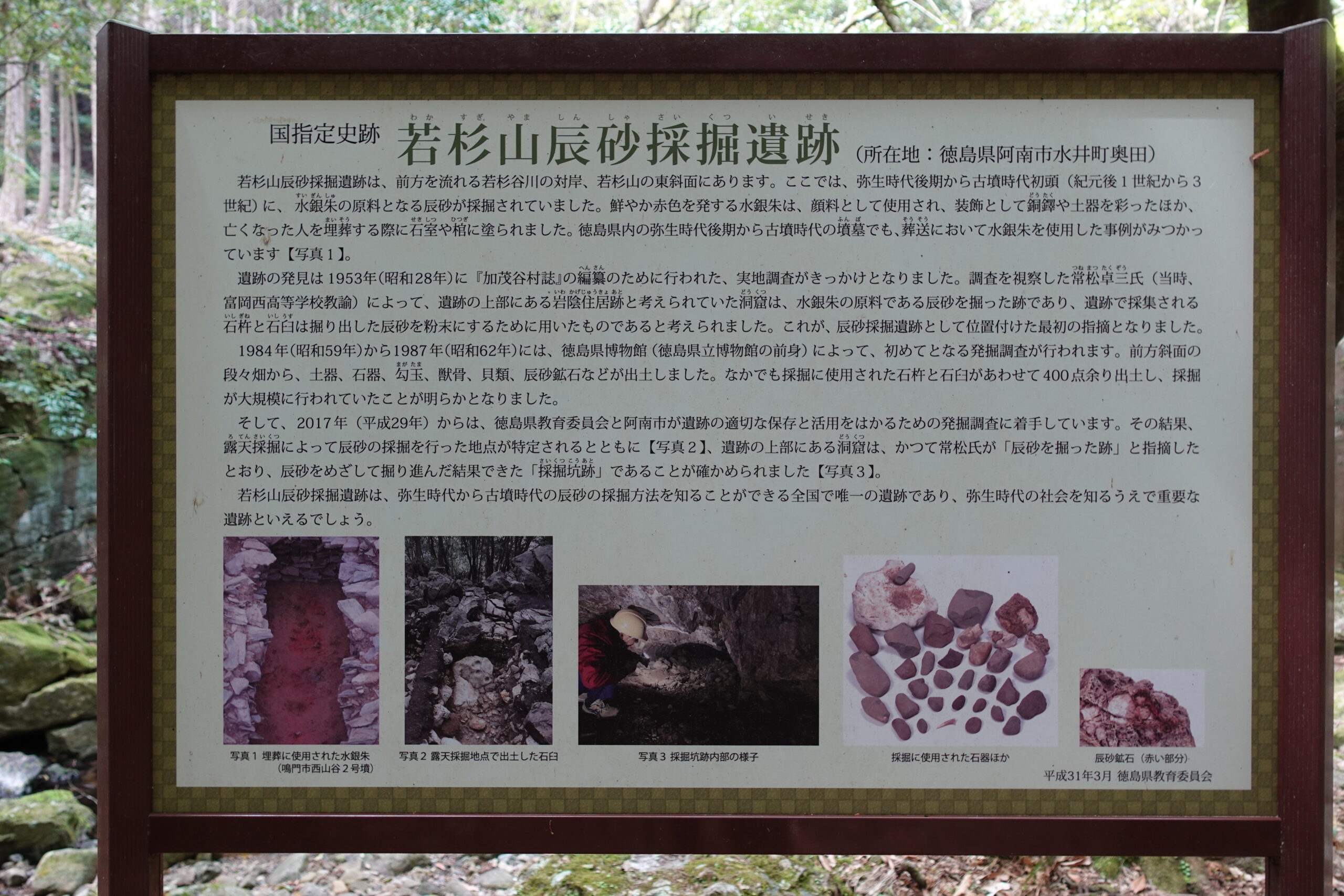 食後に周辺を少し散策してみると、「若杉山 辰砂採掘遺跡」と書かれた説明板があった。このあたりでは弥生時代後期〜古墳時代にかけて「辰砂」の鉱石が採掘されており、発掘調査により石臼や杵といった採掘道具や生活用品が大量に出土したのだそうだ。辰砂は赤色の顔料のもとになり、装飾用の銅鐸や土器、埋葬用の石室や棺を彩ったという。や、やよい…そんな昔から、ここに人の営みが。いや、むしろその頃の方がこの一帯は賑わっていたまである。今や酔狂な歩き遍路がたまに通るだけになったこの土地を、その当時からある岩たちはどのように見つめているのだろう。